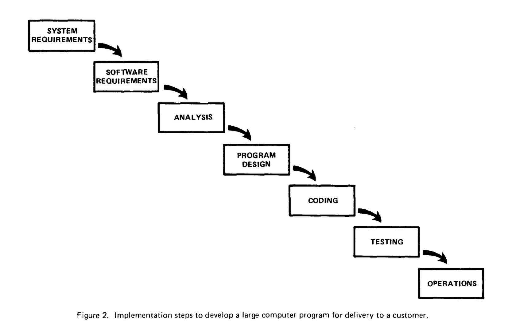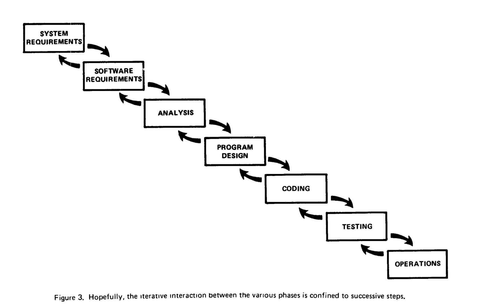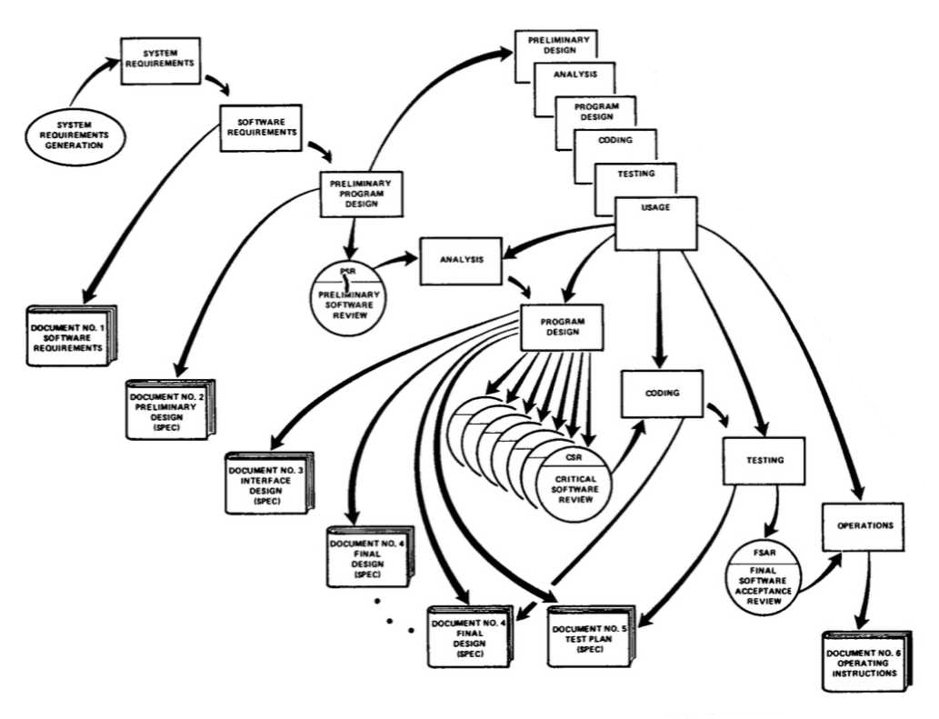 Omitting. In a podcast episode (audio, transcript), I detailed a process by which Winston W. Royce’s 1970 paper “Managing the Development of Large Software Systems” was a careful explanation of relationships between various software artifacts. He drew classic box-and-arrow diagrams to summarize his results: