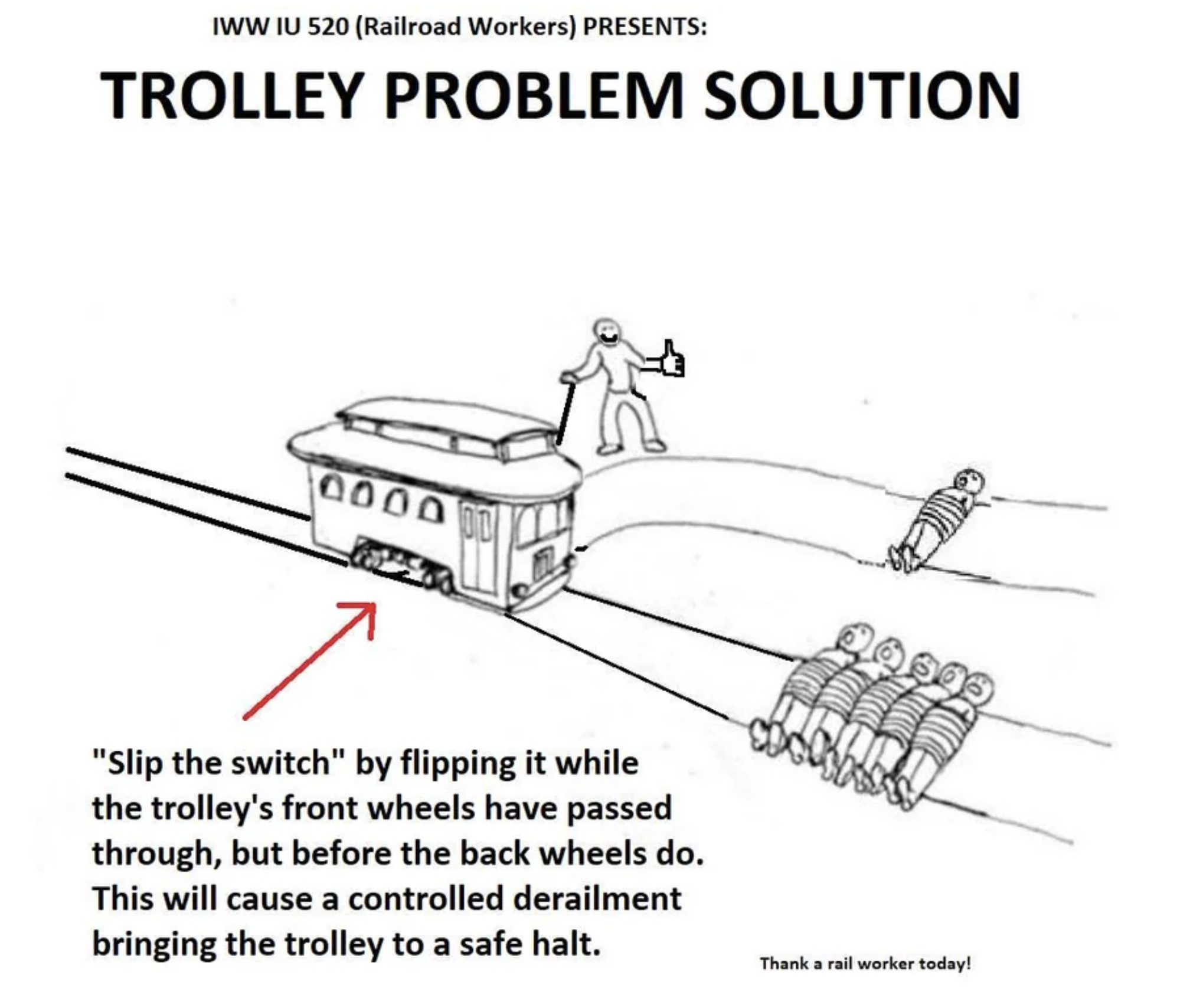 Philippa Foot asks us to imagine a trolley that will by default kill five people but, if diverted to a new track, will only kill one. Is it moral to switch the trolley to the less-fatal track?