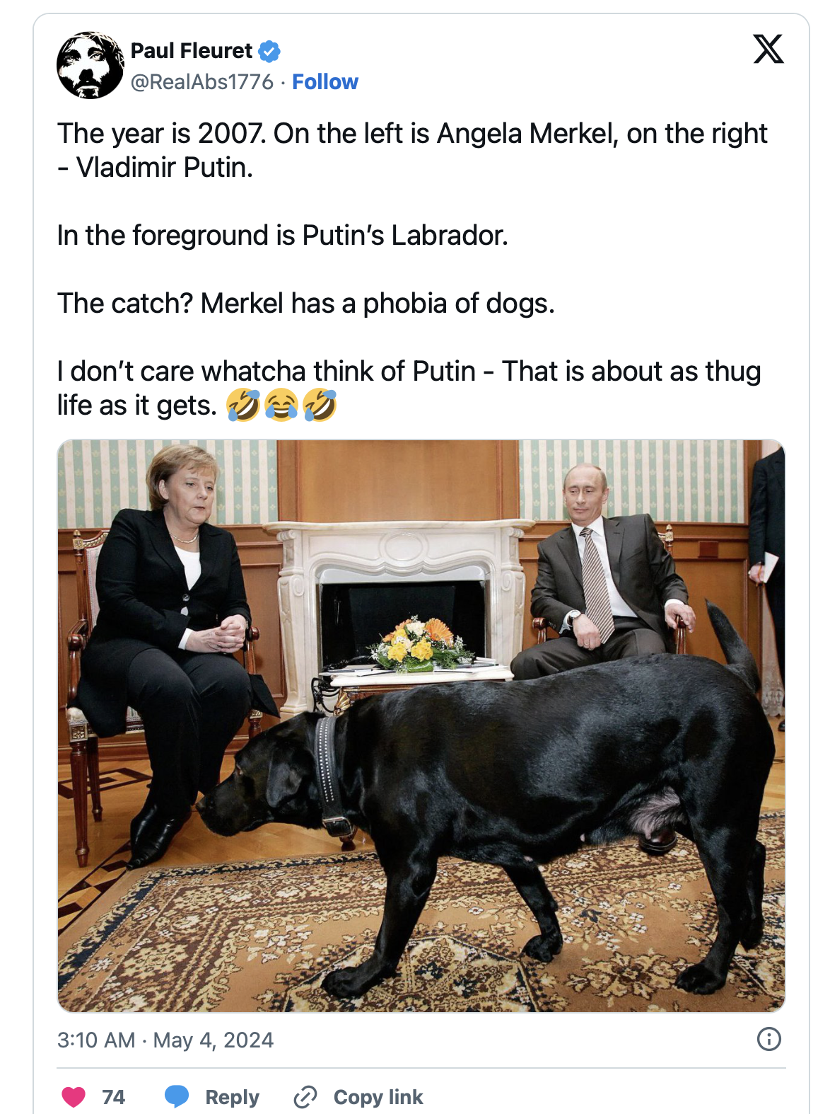 Putin later said that he of course wouldn’t have brought the dog if he’d known of Merkel’s phobia. I don’t think it’s outlandish to see that as another act of domination: